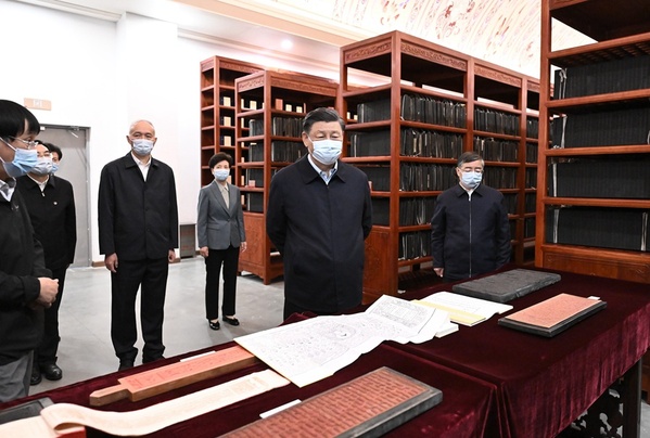 6月2日,中共中央总书记、国家主席、中央军委主席习近平在北京出席文化传承发展座谈会并发表重要讲话。这是座谈会前, 习近平1日下午在中国国家版本馆考察。新华社记者 王晔 摄