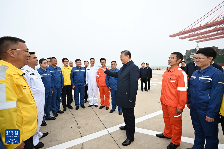 5月22日至24日,中共中央总书记、国家主席、中央军委主席习近平在山东考察。这是22日下午,习近平在日照港亲切慰问港口科技工作者、运营人员、航运人员。 新华社记者 谢环驰 摄