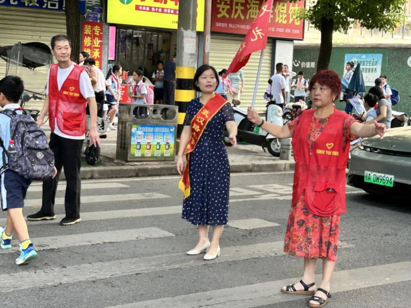 张爱兰老师(中)在校园周边开展文明宣导志愿服务
