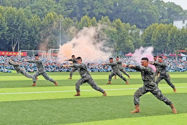 活动中,几颗彩色烟雾弹在田径场中央炸开,红色与橙色烟雾缓缓升起,在绵绵细雨中依然带来绚丽的视觉冲击。彩色烟雾的映衬下,一队军训教官跑步入场。他们身着军装,步伐整齐划一,每个动作都干净利落。“擒敌拳第一式,预备!”指挥员一声令下,教官们立刻进入战斗姿态。他们动作刚劲有力,喊杀声震天动地。漂亮的过肩摔、敏捷的地面控制、精准的锁喉技巧……教官们擒拿格斗的利落动作都引得学生们惊呼连连,掌声不断。