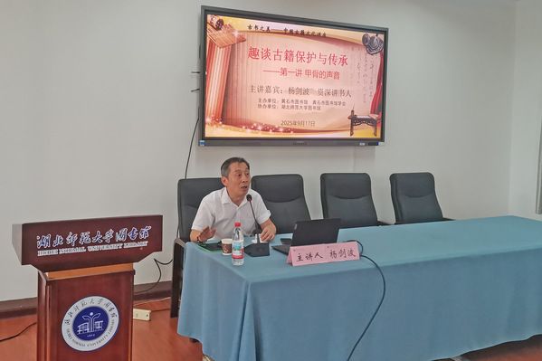 随后举行了“古书之美——中国古籍文化讲座”。文化志愿者、资深讲书人杨剑波老师以《趣谈古籍保护与传承:甲骨的声音》为题作了专题报告。他系统介绍了古籍的定义、类别与价值,重点阐释了甲骨文作为中国最早成熟文字系统的历史地位与文化意义。杨老师通过生动故事,讲述了王懿荣、刘鹗、王国维等学者在甲骨文发现与研究中的贡献,并介绍了甲骨保护与现代数字传承手段。讲座内容深入浅出,现场互动热烈,掌声不断。