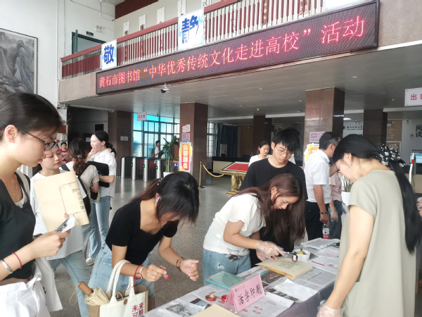 同一时间,传统文化体验活动、黄石市图书馆特藏文献展之馆藏碑帖展在校图书馆一楼大厅举行。活动现场,同学们在动手实践中沉浸式体验了雕版印刷、活字印刷、碑帖拓印等传统技艺,亲身感受古代印刷术和中华书法文化的精妙与匠心。本次活动同步展出“金石留声:碑帖舆图中的千年墨韵——黄石市图书馆特藏文献推介展”聚焦碑帖文化,展示黄石市图书馆馆藏实体碑帖六种、舆图拓本一种,包括《诒晋斋法书》、岳飞手书《前后出师表》等拓本,以及碑帖舆图、黄石摩崖石刻“露天石书库”相关图文资料,让广大读者近距离感受中华传统金石文化的魅力。展览将持续一周。