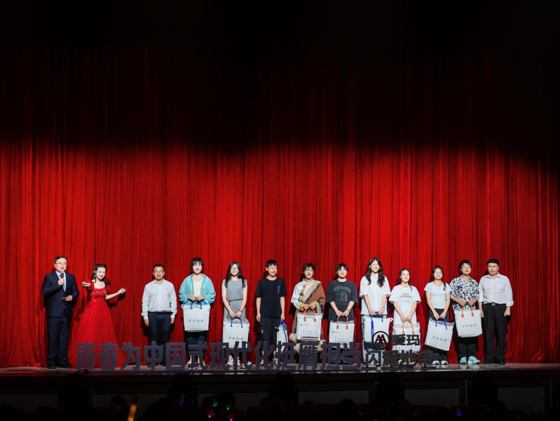 在中场互动环节,19名参与“我要上新晚”节目征集活动的2025级新生代表登台,分享各自的节目创作故事与入学以来的成长收获。校党委宣传部常务副部长祝治国、学生工作部(处)、人民武装部部长杨志丹为新生代表送上荣誉礼包,勉励新生在未来的大学生活中继续绽放光芒、实现自我成长。