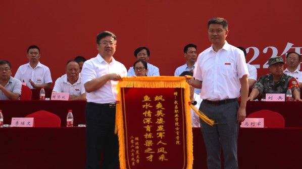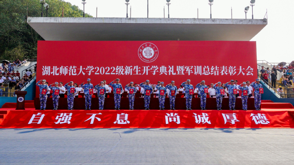 校党委副书记马列军向承训单位武昌职业学院授锦旗。校党委常委、副校长王赛玉宣读2022级新生军训表彰文件,并为军训“综合表现优秀奖”“内务优秀寝室”“军训标兵”等获奖单位及个人颁奖。