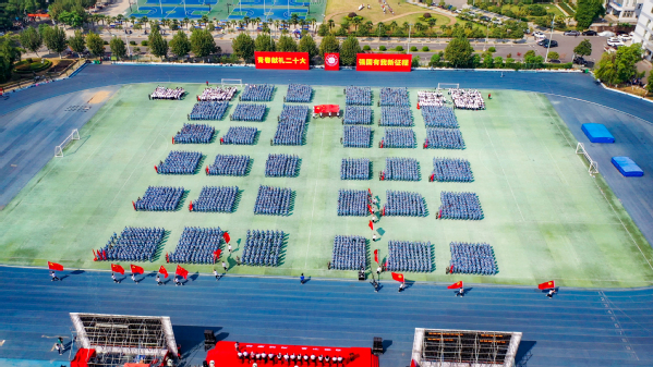 在庄严雄壮的国歌声中,开学典礼拉开帷幕。16个学院的新生代表方阵踏着整齐的步伐、喊着嘹亮的口号依次走过主席台接受检阅。6个新生表演方阵先后进行匕首操、军体拳、匍匐拳、刺杀操汇报表演,承训教官还带来了战术表演,一招一式,强劲有力,全场气势非凡、场面震撼。