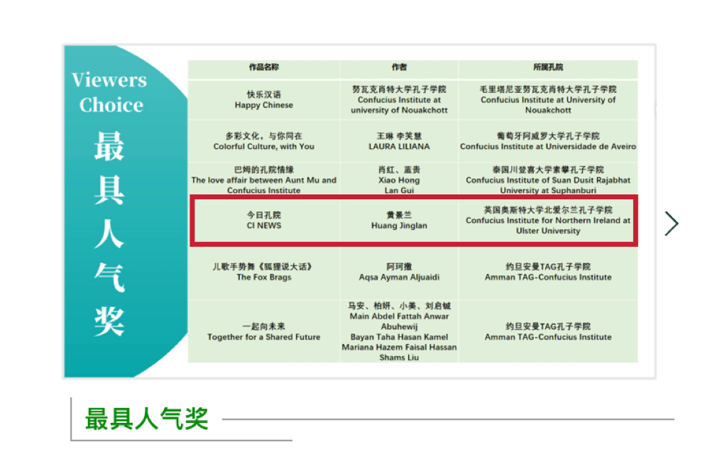 本网讯 9月27日,中国国际中文教育基金会2022“孔子学院日”活动在线上成功举办,活动揭晓了第二届“最·孔院”全球短视频征集活动获奖者名单。开云公派到英国奥斯特大学北爱尔兰孔子学院的黄景兰老师的作品《今日孔院》同时斩获特等奖和最具人气奖,开云合作院校英国奥斯特大学北爱尔兰孔子学院也荣获优秀组织奖。