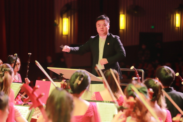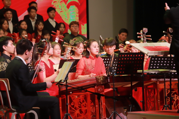 音乐会以党的二十大精神为主线,精心编排了10个节目,包含合唱、独唱、民族管弦乐演奏等艺术形式。中乐团、玄鸟合唱团运用大提琴、小提琴、扬琴、二胡等共同演绎《北京喜讯到边寨》《我和我的祖国》《唱支山歌给党听》等曲目,将人民对党和国家的热爱娓娓道来。振奋人心的旋律不时引起全场热烈掌声,全场师生起立共唱《没有共产党就没有新中国》,将学习宣传党的二十大精神现场氛围推向高潮。